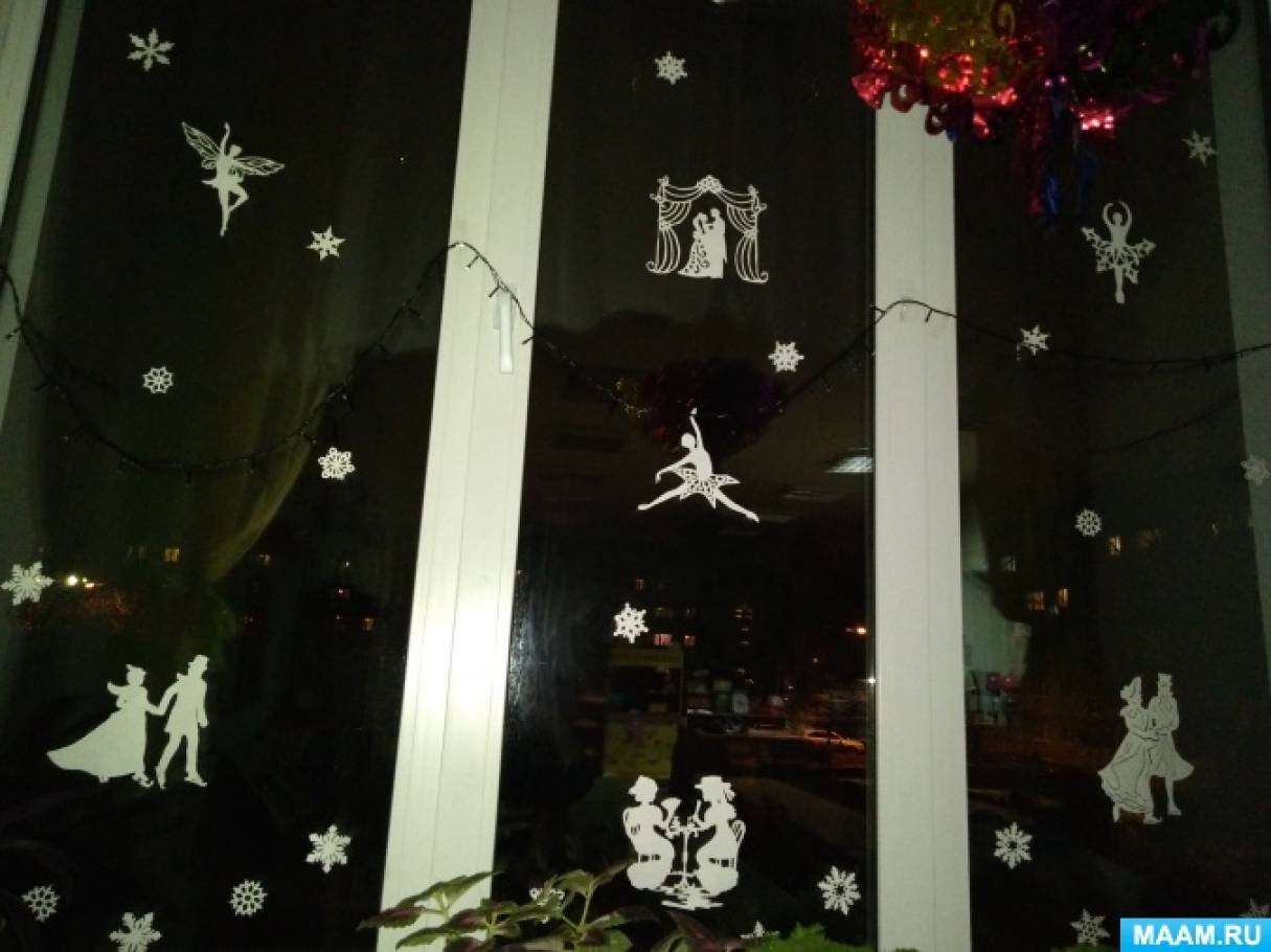 Декором в группе детского сада может быть полотно, на котором изображают домик Деда Мороза, заснеженные деревья, снежинки, животные. Подобные элементы выполняют из ткани, вырезают из бумаги большого размера.